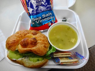 On my next visit I decided to go for the half sandwich and soup combo. The sandwich I chose was the Birds of Prey, which is turkey (so maybe should just be “Bird of Prey”?) with avocado and two cheeses you get to select. All the standard sandwiches come with lettuce, tomato, red onion, pickles, and mayo (mustard or oil and vinegar are available on request). I chose sourdough bread, and a combination of provolone and muenster cheeses (which is awesome, I mean how many sandwich places have muenster as an option?), and once again it was a mostly good sandwich with the exception of that damn avocado paste that I’d kind of forgotten about since my first visit.