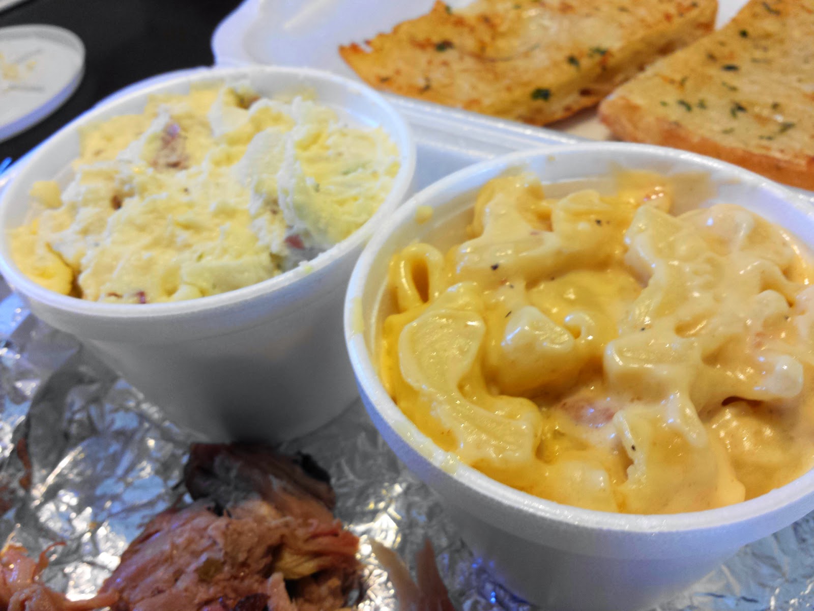This time, I decided to play it safe and just order the pulled pork plate, since it’s my favorite barbecue item (if not my favorite food, period). I chose potato salad and mac-n-cheese for my sides, even though it added another buck-fifty to my order (the only sides that you can get at no extra cost are beans, slaw or fries). While I waited outside the window, I did my best to avoid their little patio fire pit, which had mostly burned down to embers and was billowing substantial amounts of irritating smoke. Luckily, the nature of the cuisine means that it’s pretty much made in advance and held, so it was only a few minutes before they passed my heavy foam take-out container out the window.
