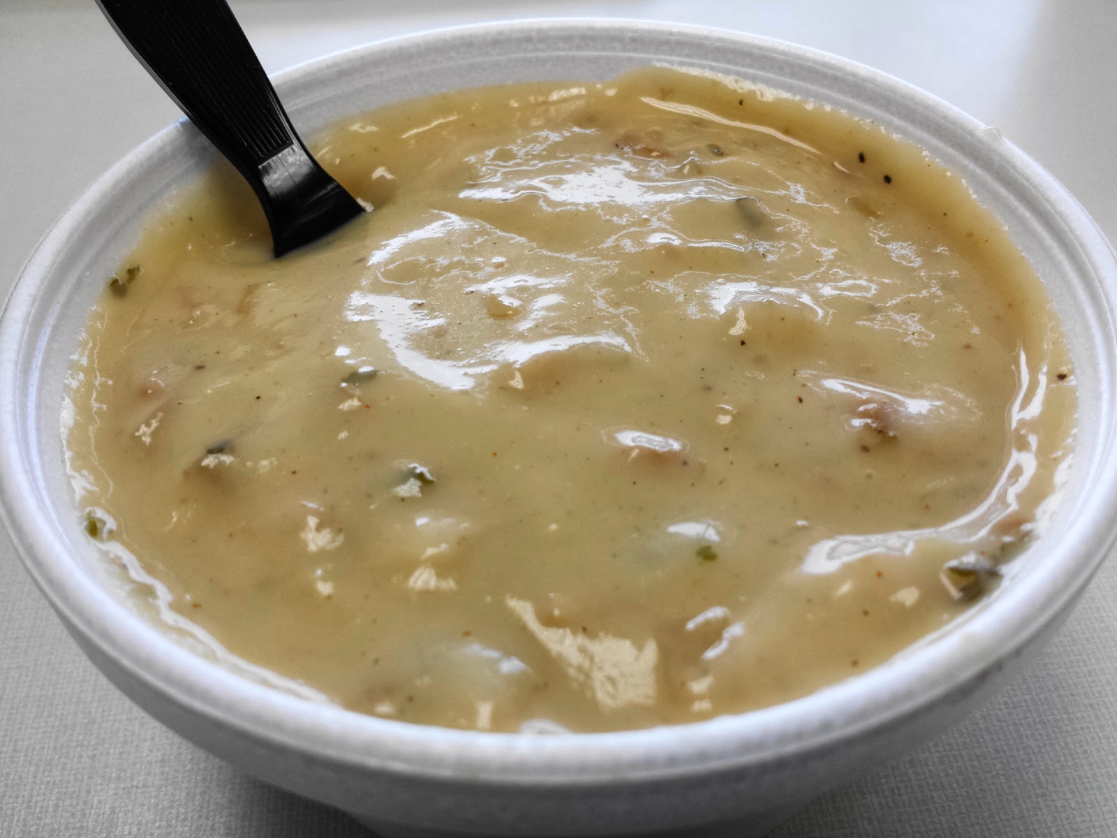 Same deep-fried menu too, though there are a few grilled options as well. Still, I wasn’t looking for healthy at the moment. I ordered the popcorn shrimp platter, half a pound of the little buggers with a pile of fries and a side of coleslaw. The zombie-like cashier (seriously, his expression never changed and his voice had no real character or distinction to speak of) asked if I wanted to add on some clam chowder, and since they’re famous for it and I can’t remember ever having tried it, I told him to go ahead.