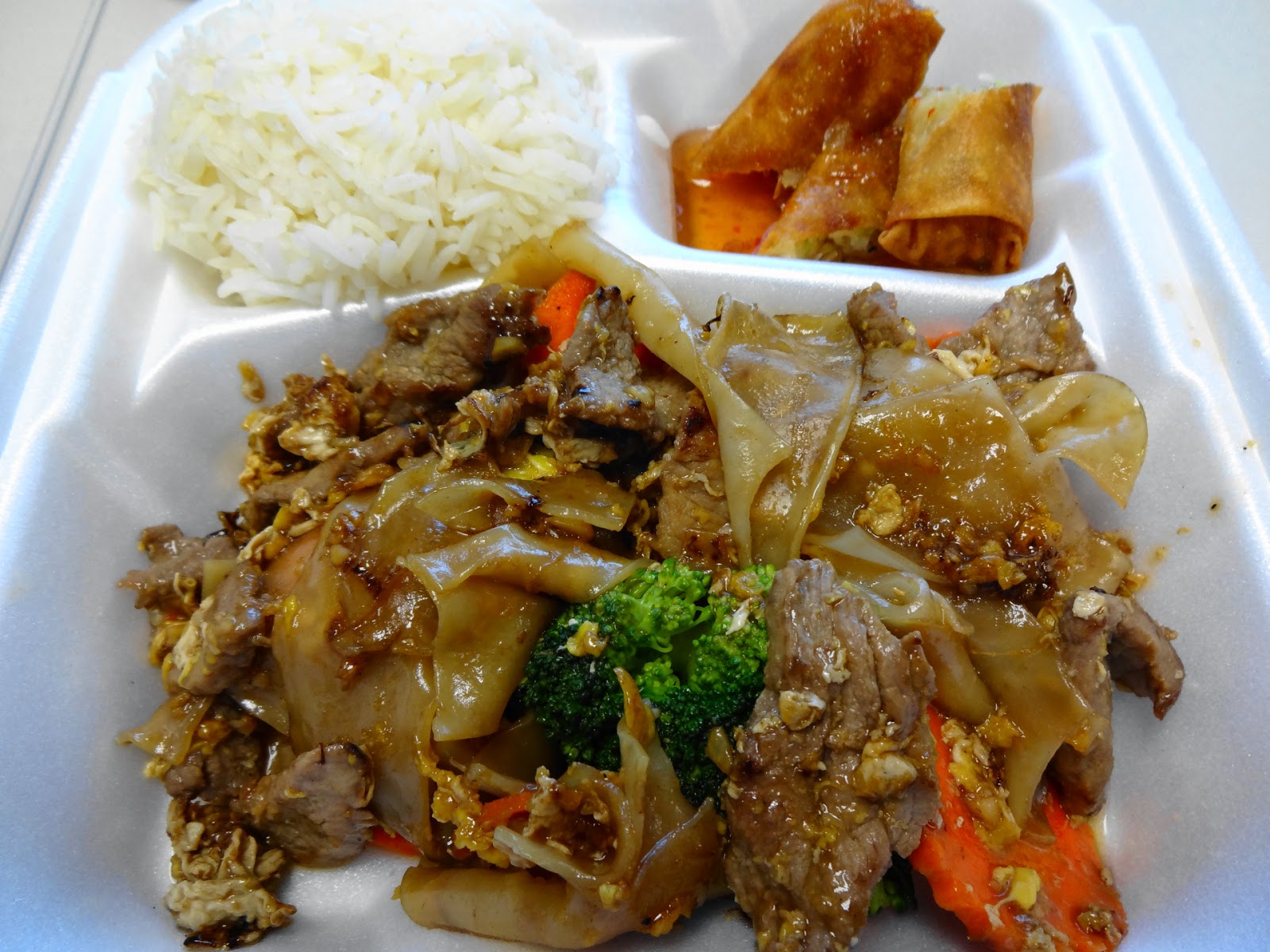 Not much to say about the steamed rice, it was fluffy and moist without being soggy. The spring roll is, interestingly enough, cut into three pieces and put into a compartment of the take-out container along with what would normally be a dipping sauce. It didn’t bother me, but people who like to go light on sauce might not approve. The Pad See-Ew was good, not the best I’ve ever had but FAR from the worst. Personally I refer Krung’s to, say, Pad Thai House. Everything tasted good and was tender without being mush, but the veggies could have been cooked a little longer, as they were just a little bit closer to raw than I normally like.