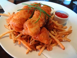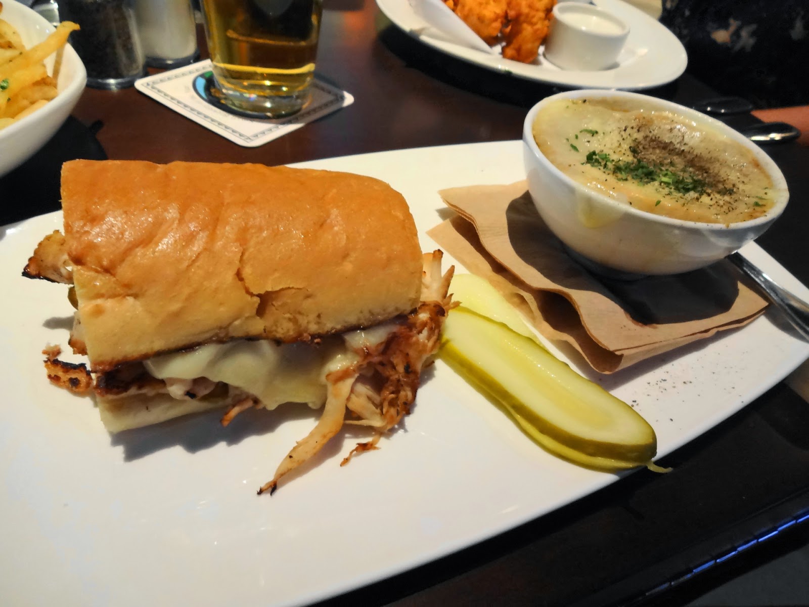 The Onion Ring Tower was as awesome as it sounds, and since I’d never pay the normal nine bucks for the 25 onion rings you get, but half-off for happy hour is much more reasonable. Beer battered, dusted with parmesan and served with both ranch and chipotle dipping sauces. Very yummy, novel presentation, and of course it’s a food that encourages beer consumption. As for main course, the roommate chose the Roast Beef Dip, with a side salad that I completely spaced on getting a picture of. I was torn between a couple of items, neither of which I ended up getting once I found out that the fish in the Fish & Chips was haddock. The children ordered a couple of items that had been added to the kid’s menu since our previous visit, the Chicken Teriyaki and the Barbecue Chicken.