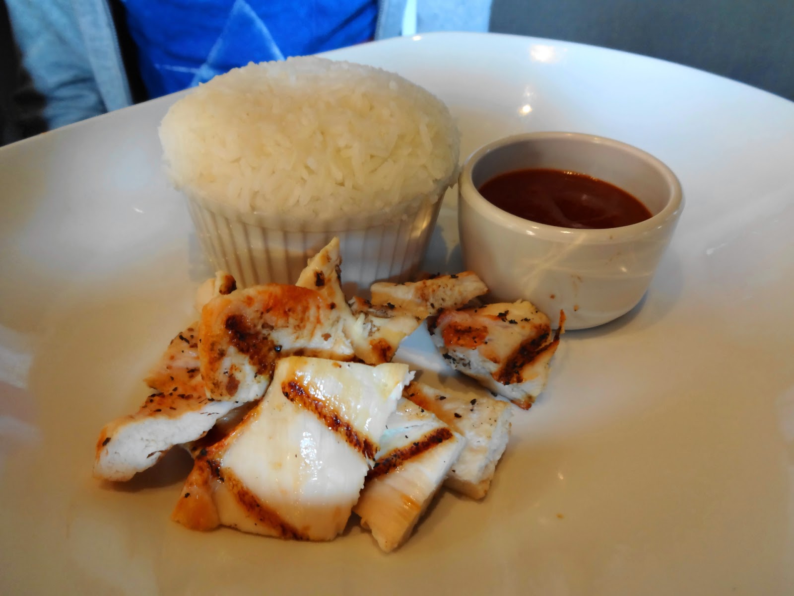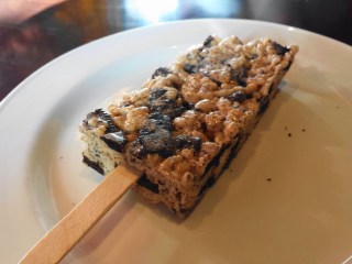 Kid’s meals do come with a drink and a dessert, so that took a bit of the sting out. The dessert choices are fresh fruit or a Cookies and Cream Crunch Pop, which the waitress described as being like a Rice Krispy square, with Oreos mixed in, on a stick. The roommate tried a bite and confirmed that was a very accurate description.