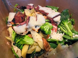The picture above is of a recent addition to Cacicia’s menu, and I’ll let the guy who runs the show explain it:  A bed of fresh romaine, spinach, signature bruschetta, all the sautéed, farm-fresh vegetables your heart desires, and our 140 year old traditional family house-charbroiled meatball patty. Topped with provolone and our house vinaigrette!