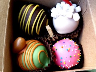 I don’t catch up with the lovely ladies at Cake Ballers very often.  There are a number of reasons for this, including but not limited to the fact that they’re Downtown and have very limited hours.  Plus, it’s not often that I crave sweets.  The last time I visited, I made a special effort because they were selling the “Circus Sampler” you see above.  Clockwise from upper left, you’re looking at chocolate-covered banana, root beer float, cotton candy, and caramel apple.  These women do for bite-sized, frosted balls of cake what Jelly Belly does for jelly beans.