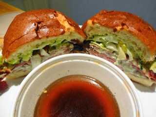 Once upon a time, there was a sandwich shop in Meridian called 2 Fat Guys Fresh Deli.  I had visited them twice and was in the process of writing the review when weird things started happening on Facebook.  As well as I understand it, first the owner said that the restaurant was closed indefinitely due to his chef and the rest of the staff quitting by text message.  Then he indicated that he was working on re-opening.  Then the Facebook account just kind of vanished.  A few weeks later the chef re-opened as Fat Guy’s Fresh Deli, in the same place and with the same menu, and things seem to be running a lot smoother now.  Still, I feel like I should just start from scratch on the write-up, but in the meantime here’s a pic of one of their amazing sandwiches.  That’s roast beef, bleu cheese, bacon, pesto mayo, and au jus for dipping.  Messy and absolutely delicious.