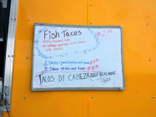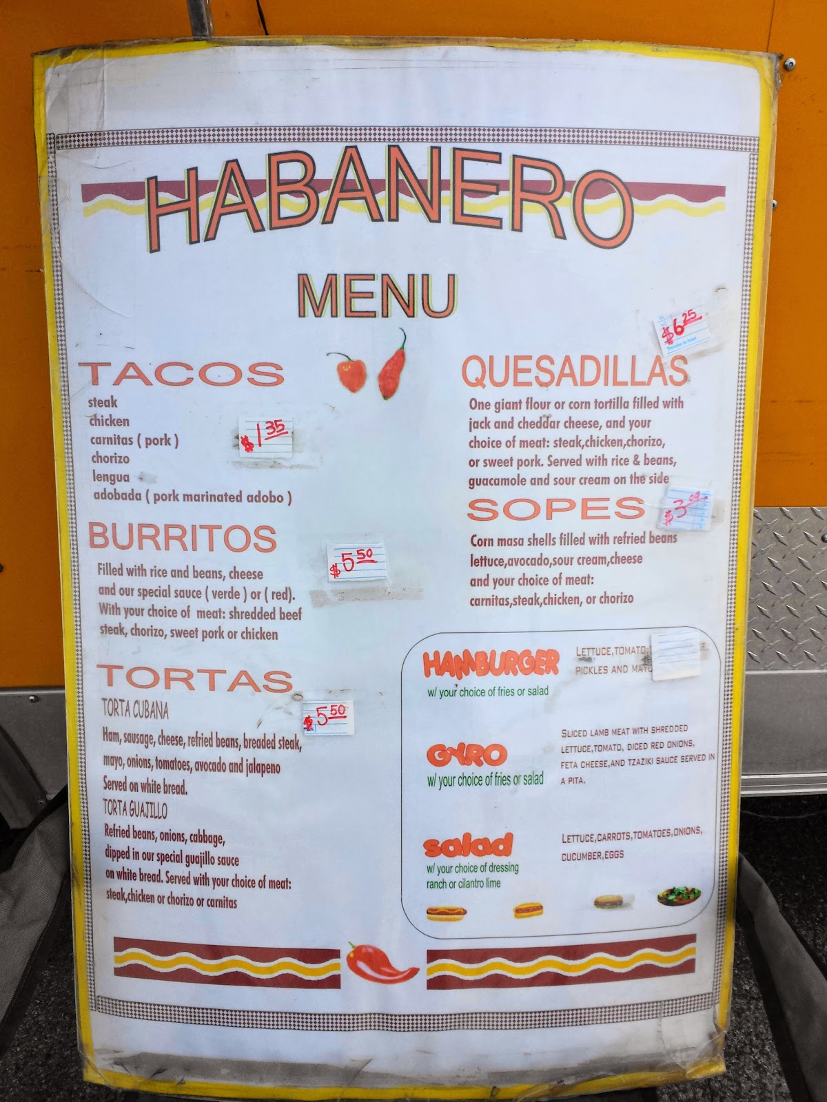 Every instinct in my body told me to just turn around and walk away, but I’m a stubborn mofo. I stood my ground and asked him what he DID have. He said they no longer made the gyros or burgers anymore, he only had the Mexican items now (except the tortas, at least for the immediate future). I guess that’s why the prices of the non-Mexican options are whited out, though crossing them off entirely would seem to make more sense. I looked at the white board next to the window where the specials are written.