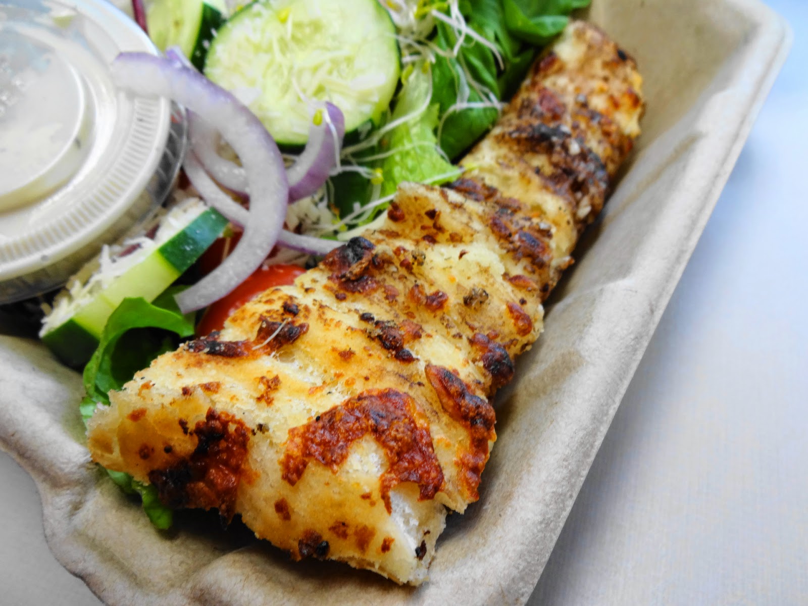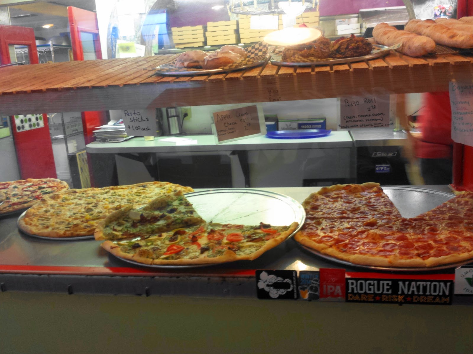 When I showed up for lunch, things were looking good. There were several varieties of giant pizza slices available for reasonable prices. I ordered a slice of veggie and something called a “Pesto Stick”, which appeared to be a long breadstick sliced at an angle and brushed with pesto. Which makes sense when you consider the name. They fired my pizza slice and gave it to me laid out on two sort of side by side, normal-sized paper plates, wrapped in foil to hold it all together. Odd, but effective. The Pesto Stick was just wrapped up, and I figured it would be a good in-car snack while I drove back to my office.