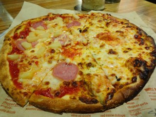 | Pineapple and smoked ham on the left, just cheese on the right. |