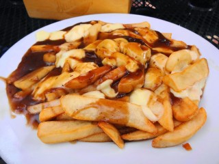 …but they also have a spacious and gorgeous patio with a terrific view of the mountains, and that’s where everyone was sitting the afternoon we dropped by. I’m not much of a beer fan, but the roommate is and I do enjoy one or two with this style of food, but we had a long drive ahead of us and stuck with soft drinks. I honestly don’t recall if the place didn’t have a kids menu (their website doesn’t show one), but both children ordered from the appetizer section: Mozz Sticks for the tween, which she loves and can easily make a meal of, and Finger Steaks for her little sister. Both adults being big fans of French Dip, we each ordered one of the Home Style French Dip & Fries (though we chose salad instead of the fries) plates. I also tacked on an order of the Pub Poutine, simply because I just can’t NOT order any variation of poutine I come across.