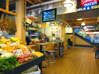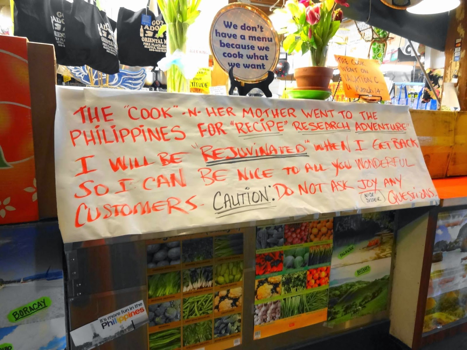 I wish I hadn’t. I was excited when I saw them, and they were literally swimming in liquor. Unfortunately that liquor didn’t have a lot of flavor, so maybe it was partly water as well, but that wasn’t the big problem. Perhaps you’ve heard of gritty oysters? Well these were downright crunchy. I hoped the first one was just off, but the second one I actually lifted from the shell with the fork and found all kinds of little black bits hiding underneath. I tried to scrape all of them off, but I must have missed a few. The third oyster got tossed directly into the trash. Feeling a little dejected, I headed around the corner to a spot I had heard about on the truly awesome blog Nomumental. If you’re Seattle bound, I heartily recommend checking it out. Anyway, there is an Oriental mart in Pike Place called, well, Oriental Mart. I love Asian markets, but what drew me to this place was the fact that they have a deli counter serving Filipino dishes. At this time, I will point you at Nomumental’s write-up, because I have absolutely nothing to say about their food.