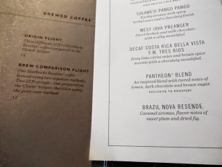 All of the usual suspects are represented. If you want a mocha, you can have one. A macchiato? No sweat. But there are a lot of other, more unique options (and if the reviews I’m reading on the aggregate sites are any indication, there are a lot more of them now than there was when I visited). Since this was my second Starbucks run in two days, I decided to take advantage of the unique opportunities that only the Roasteries offer.