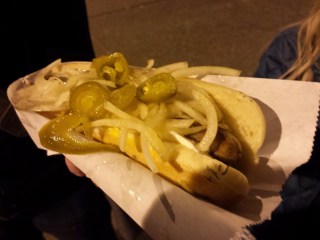 If you’re curious, Hozier puts on an awesome show (I’ll be nice enough not to go into any depth regarding my thoughts towards the opening act), and the Paramount is a badass theater. Eardrums rattled, overpriced t-shirts purchased, and everyone a little too keyed up to sleep, I suggested a late bite. If there’s one thing you can always count on finding in any decent city after a concert on a weekend evening, it’s a hot dog vendor. I’d sold my roommate on the idea of trying a Seattle-style hot dog, and I knew just the place to get it.