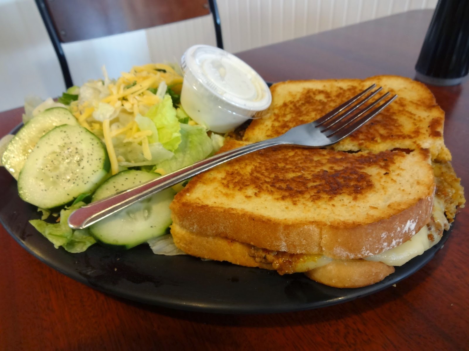 The roommate, a huge pepper jack fan, picked the Taco Jack sandwich: taco meat, pepper jack cheese, avocado, and usually tomato but she despises them, on white bread. I didn’t try it because I loathe “taco meat”. Not the meat you find in actual tacos mind you, just that wet, over-seasoned ground beef paste you find at places like Taco Bell. She seemed happy enough with it, and she ordered it with a side salad to kind of balance out all the bread, butter and cheese we’d been consuming.