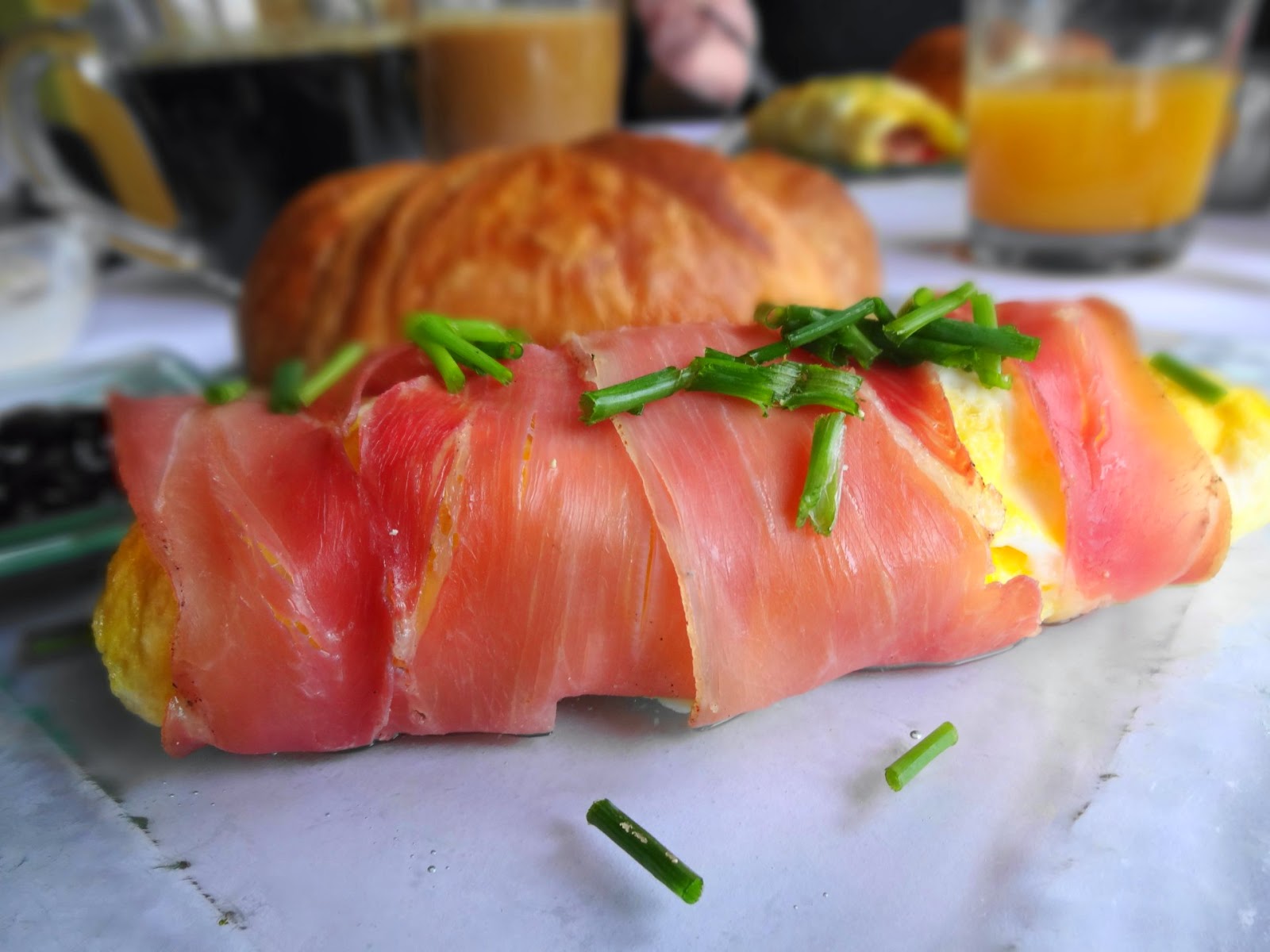The Paris omelet is a little simpler, being stuffed only with French brie cheese. Of course, then it’s wrapped in prosciutto. And I don’t mean perfunctorily, the thing is more or less completely encased in prosciutto. Pretty much every bite is going to have prosciutto on at least two sides, sometimes three. Then, just for good measure, it’s garnished with fresh chives. It’s arguable whether this is the best omelet I’ve ever been served in terms of flavor (lots of different things you can put in an omelet, after all), but it’s definitely among the very best. It’s certainly the best-executed one I’ve ever had. As a bonus, it also led to the most food-porny picture I’ve ever taken.