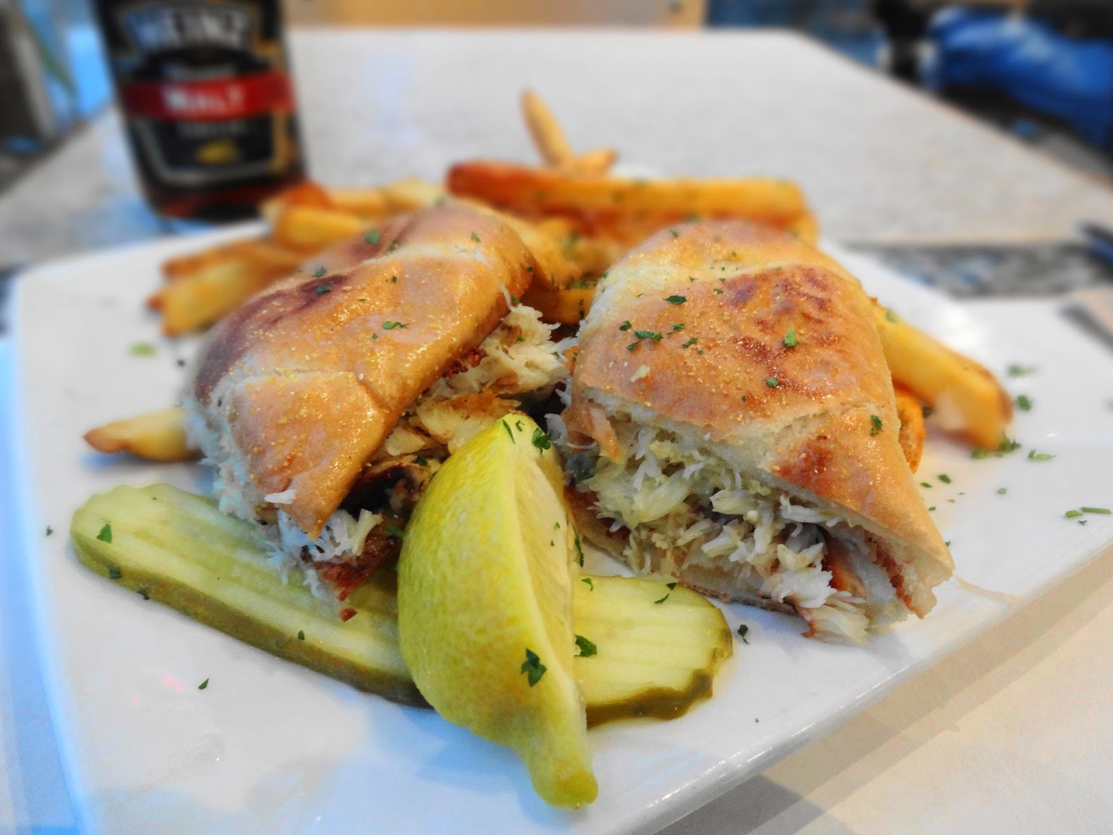And now we come to the main event: the Crab Po’ Boy. Per the menu, dungeness crab and green chili avocado puree on grilled parmesan-crusted hoagie, with fries. The crab, aside from the one tiny piece of shell, was great. I loved the puree, and even the hoagie roll was good. It’s a solid dish. It also royally pissed me off.