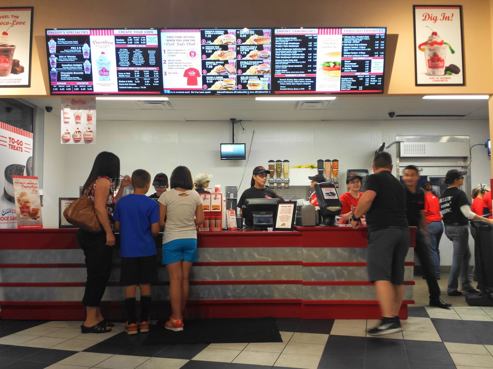 Oh yeah, the custard. Freddy’s frozen custard is a harder variety than Stan’s used to serve, and is also only available in the standard chocolate and vanilla varieties. You can get it plain in a dish or cone, as a concrete (with a mix-in), or as the base of a sundae. There are 27 toppings/mix-ins to choose from, as well as some pre-set combinations like turtle or Hawaiian. If you don’t feel like mucking with a spoon, they can also turn that rich creamy goodness into a shake or a malt, which I highly recommend.
