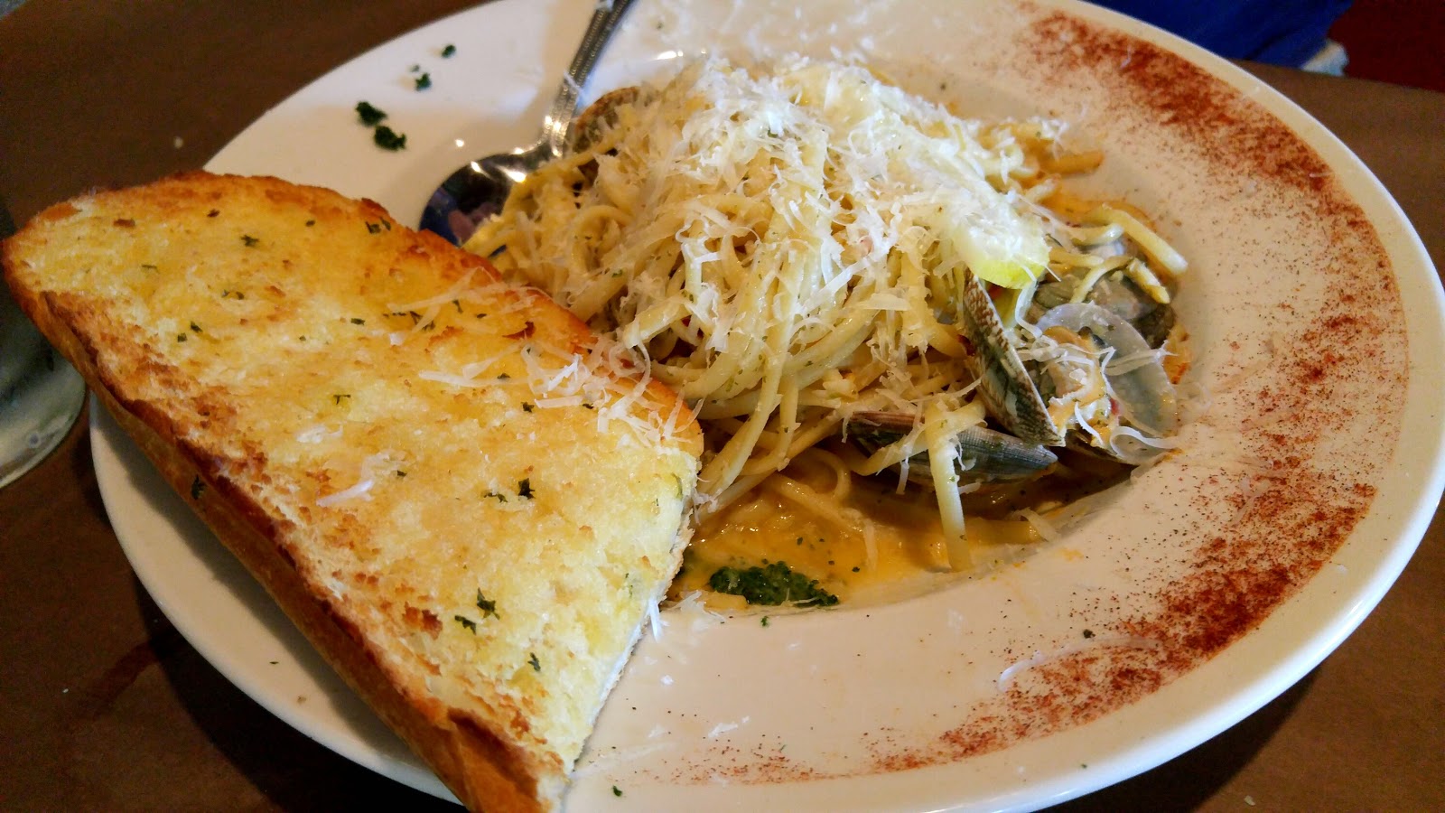 My friend chose the Linguine Alla Vongole (Clam Linguine). Per the menu: “Clams with olive oil, fresh garlic, white wine, lemon, parsley and crushed red chilies for a little heat.” It’s kind of a staple dish, as I’m sure everyone knows. The pasta was cooked perfectly, as were the clams, but the woman across the table kept commenting about how heavy the garlic flavor was. Now myself, I like garlic, and a LOT of it. I tried her food and told her that it wasn’t too much for me, but having had a few days to reflect, I’m not sure that’s the case. I tried two or three bites of her food interspersed with my own. If I’d had to eat a plate of that stuff, I think it’s safe to say that the garlic would have been overwhelming to me after a while.