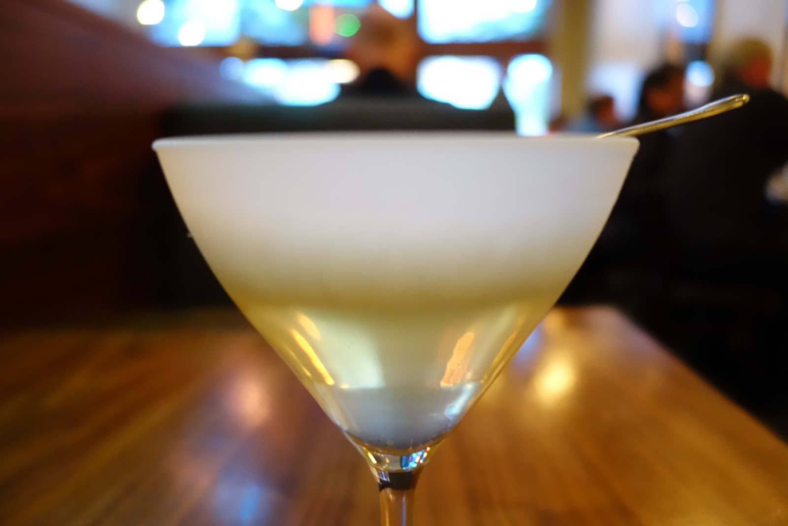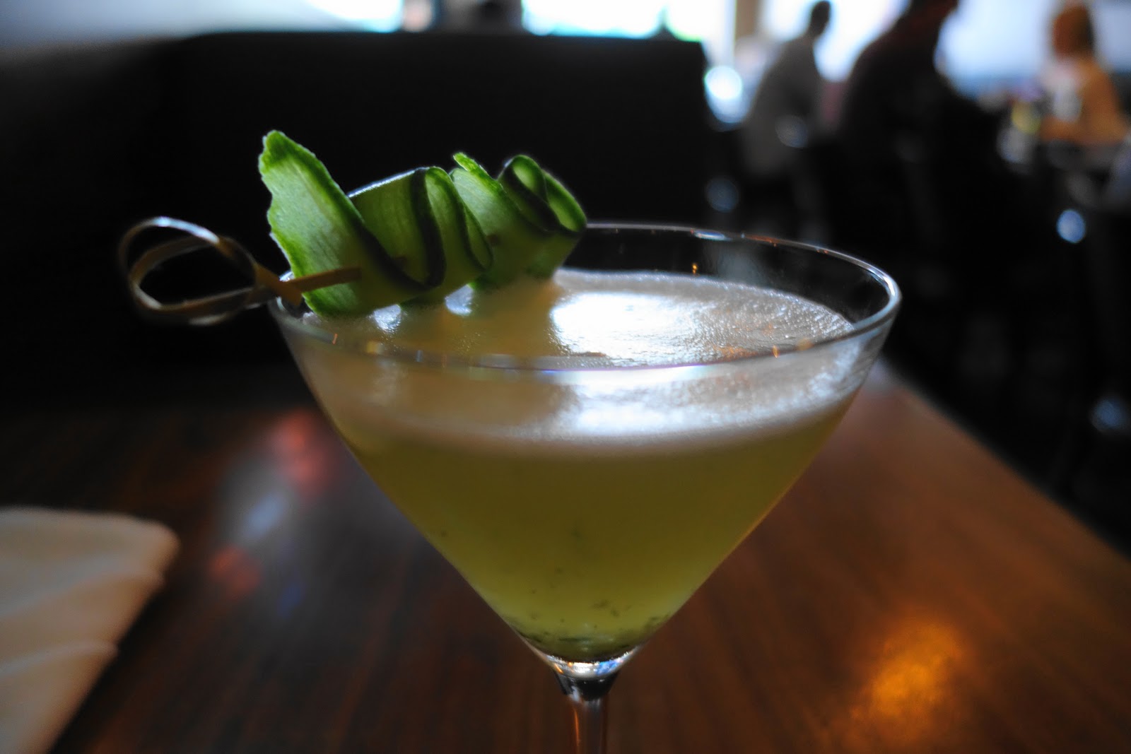 Still, I was indecisive. There were other very good looking places to go and spend a lot less money. The day before I was to leave for my trip, I decided to call them and ask how much notice they needed if I wanted to pull the trigger, and they said 24 hours. I was then offered the choice of the tasting menu shown on their website, or just letting the chef do his own thing. How could I resist that? I made the reservation. Then I went to my Facebook page seeking confirmation from my friends that I hadn’t lost my damn mind. I mean $115 before drinks or tip is a decent chunk of change. When all was said and done, this one meal would cost me about a day’s salary. One helpful soul recommended I save money on the overpriced bar drinks by having a couple at the hotel before I headed out. Far be it from me to argue with a lady. That double bourbon I sank had me feeling very relaxed and happy as I strolled in for my meal, even though I’d had to park half a mile away and jog to make it by the appointed time. I was seated at a cozy little two-person booth. My waitress confirmed that I was indeed there for the tasting menu and asked if I wanted to do the wine pairing for an additional $45. Wine on top of bourbon sounded like a bad idea, but I had seen a cocktail on their menu that looked like it would be a refreshing accompaniment: the Cucumber Gimlet.