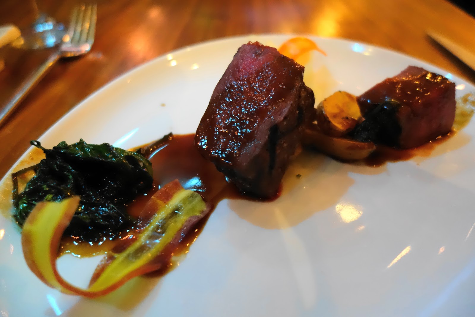 Seared scallops (one of my faves), morels, truffle cream, pomegranate foam, lemongrass, kaffir lime, asparagus, and pomegranate seeds. Some of that I remembered, the menu filled in the rest. BEST scallops I’ve ever had by far. I didn’t even mind the foam at this point, even though it didn’t do the same disappearing act the one earlier had. The knife was a joke, I used it to keep things civilized but the scallops cut like warm butter at the slightest prodding from my fork. This was one of those dishes that has so many components that no two bites taste exactly the same. For the second time this meal, I found myself wondering if the dish I was eating was available on the regular menu, because I would be exquisitely happy with just a big plate of it. It was gone far too soon. Plate and utensils go bye bye, to be replaced by another knife and fork.