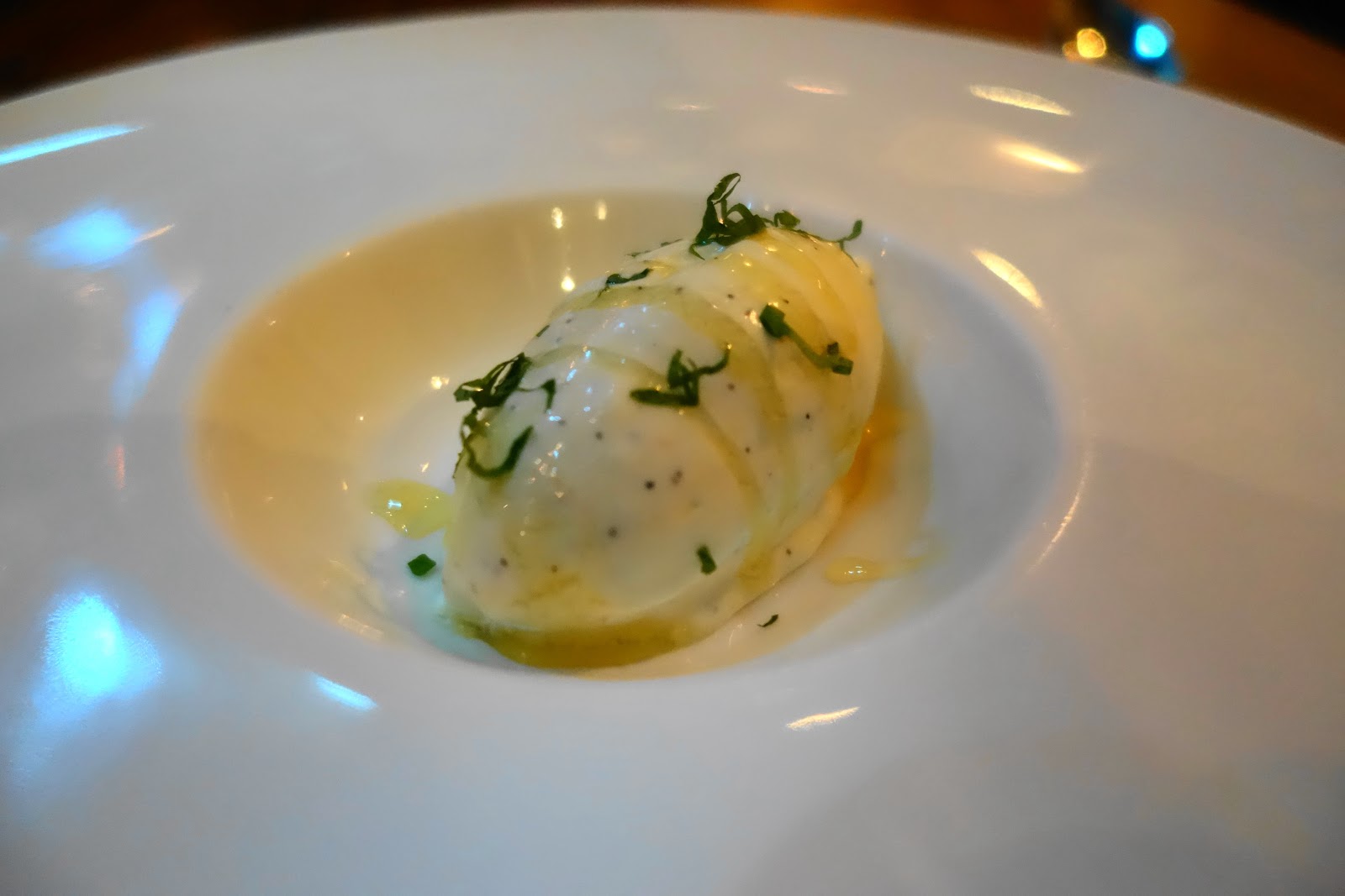 And there is the aforementioned Ramen Carbonara. Laura smiled, she knew it was coming when I had mentioned my slight disappointment about not being able to try it, she just didn’t want to ruin the surprise. Fresh noodles, edamame, pork belly, and tonkotsu broth cover the ramen component, while the carbonara is represented by arugula, bacon, and parmesan. The halfway point is the egg, a central ingredient in both dishes, represented by a raw quail egg yolk here. I had no idea what to expect aside from the novelty factor. I had tried to reconcile what tonkotsu broth and parmesan cheese would taste like together and just couldn’t make it work in my head, but of course the chef made it work. This would be a terrific textbook example of a fusion dish. The table was cleared again, and I was given only a fork for the next course, which Laura brought out several minutes later (she didn’t clear the table or bring utensils, but she delivered most of my food for the remainder of the meal).