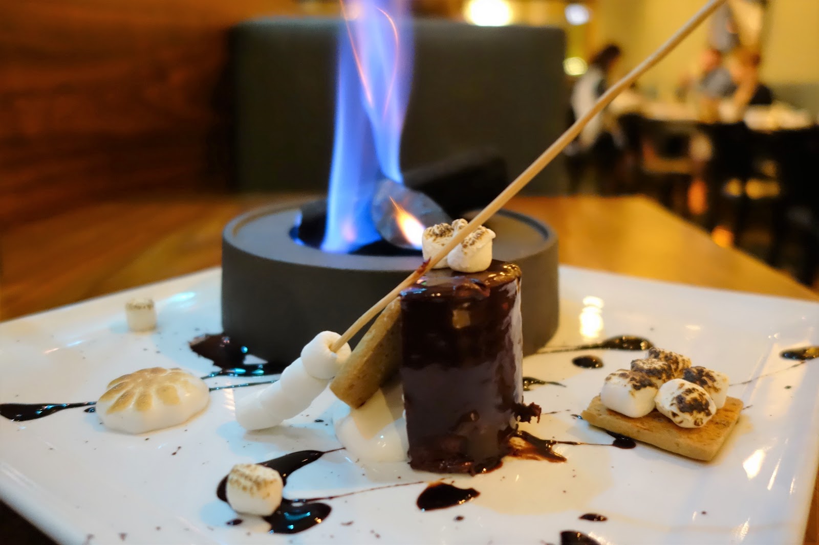 And then this. What the hell? Had my math skills completely abandoned me? I wanted to look through my camera and see how many courses it had actually been. I wasn’t even hungry anymore, but the prospect of toasted marshmallow awakened reserves somewhere in me that I hadn’t known were there. She set the plate in front of me and lit the miniature firepit with a flourish. This item is on the regular menu, in a manner of speaking. The menu says Mirror Glazed Chocolate Cake (look at the finish on that icing), and next to that “see server for today’s cake”, so I’m guessing that while the central item doesn’t change, the presentation does, and I was lucky enough to get the s’mores version. There was even a skewer of mini marshmallows for me to toast myself.