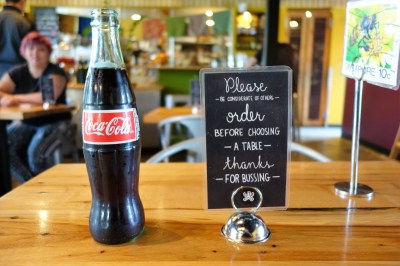 I took my place in the short lunchtime line, debating internally about what to order. When I hadn’t decided by the time I reached the front of the line, I explained my dilemma to the cashier. I’d skipped breakfast that morning, so the Chilaquiles sounded good, but I was also very interested in the Spicy Fried Chicken that I’d read so many raves about. She suggested a compromise of sorts: an order of Chilaquiles with a side of the Spicy Fried Chicken (side meaning smaller portion I assume, and without all the accouterments). A woman after my own heart, right? I agreed, added a bottle of Mexican Coke, and found a seat.