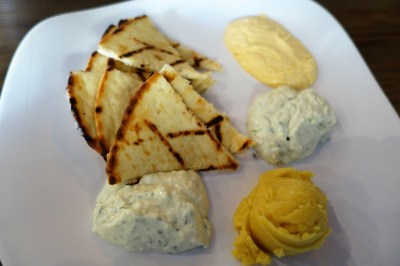 This bothered MGR not a lick since she already had her mind set on the chicken. Me, I generally eat chicken only as a last resort in most instances, and I wasn’t feeling adventurous enough to try the fava croquettes; pork it would be. We decided to sample the dips plate from the sides menu as well.