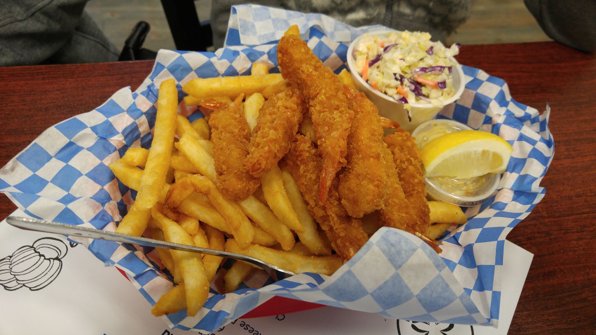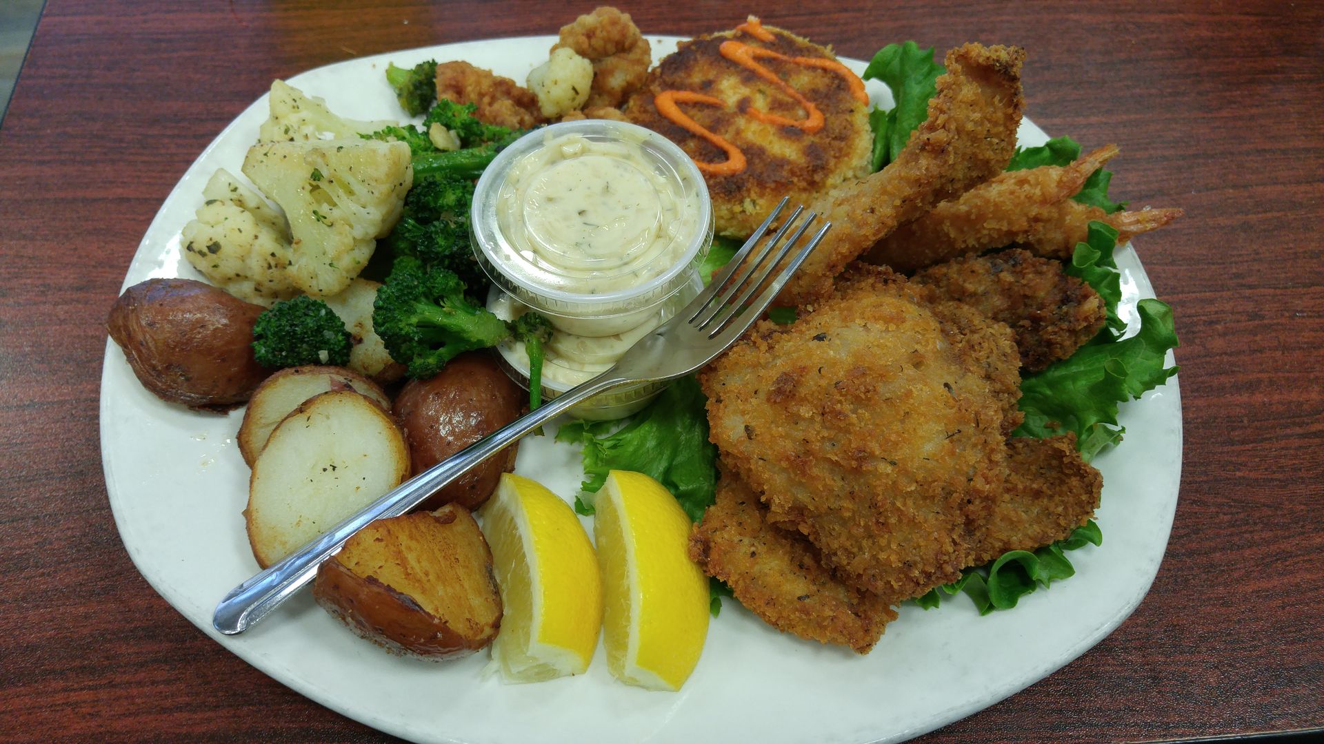 Every seafood shack has that one plate that’s basically a little bit of everything, fried. The Captain’s Platter is a pretty common name for this dish, and that’s what it’s called at The Fish Peddler. Their version comes with oysters, shrimp, fish, crab cake, and clam strips. Oddly enough it’s served not on a bed of fries, but rather with a roasted veggie medley consisting of red potatoes, broccoli, and cauliflower. It doesn’t quite negate the effects of all the breading on the proteins or the oil used to crisp it (though once again, the food is very light on the grease), but at least it doesn’t add to it. Plus, it breaks things up a bit. I love veggies, and have no issues with some healthy sides accompanying my non-healthy entrée. Once again, everything was amazing. Perfectly cooked (so important with shellfish, rubbery mollusks make me sad), the fish was flaky and juicy, and the crab cake was the crabbiest one I’ve ever had.