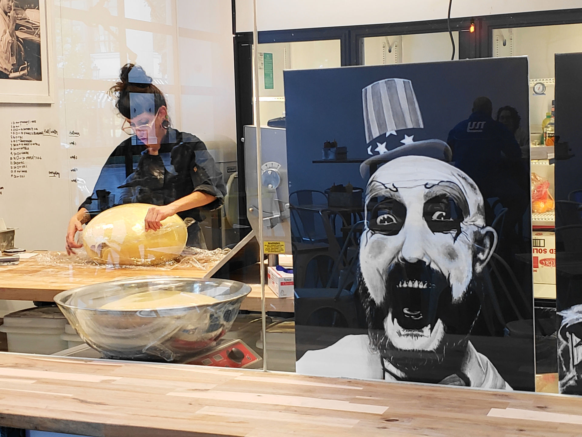 The first thing I was confronted with walking into The Donut + Dog that morning was a little room with big windows, containing an employee working the hell out of giant blobs of their proprietary 20 hour brioche dough. The second thing was an artistic rendering of Captain Spaulding, a character portrayed by Sid Haig, one of my favorite actors. Haig died very recently, so seeing this made me a little melancholy for a moment, but it was right next to a rendering of Michael Keaton as Beetlejuice. Since Keaton’s still alive, I’m guessing it was more of a Halloween thing than any kind of memorial tribute.
